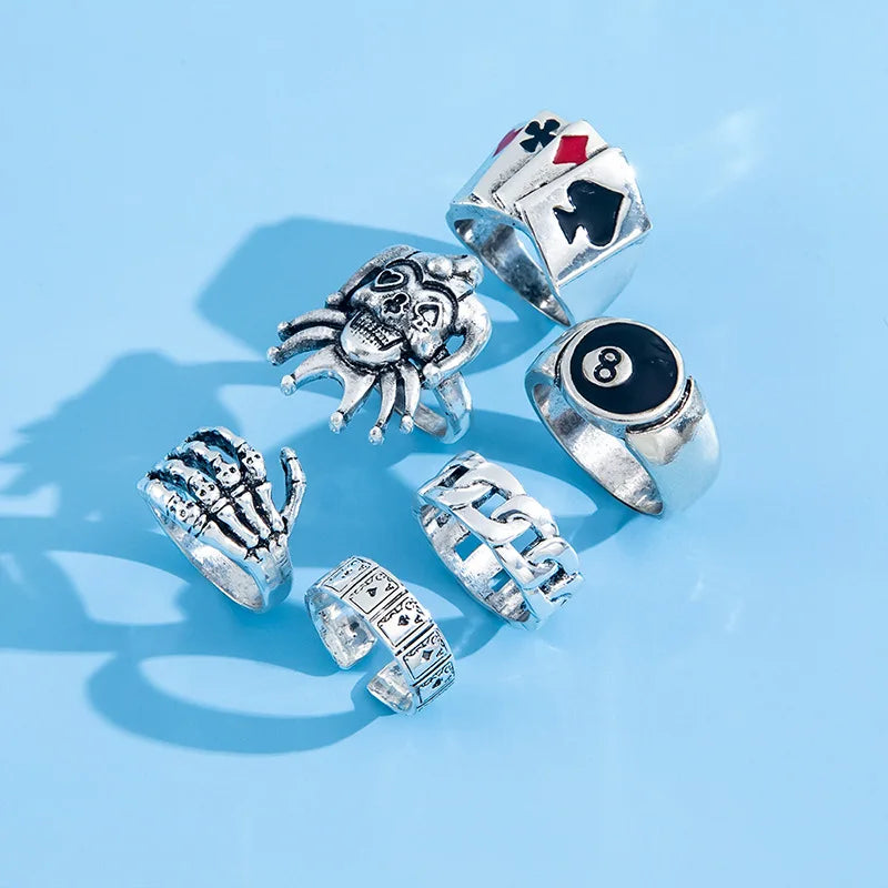 ชุดแหวนโจ๊กเกอร์โป๊กเกอร์สไตล์พังก์ 6 ชิ้น – สีเงิน เครื่องประดับแฟชั่นสไตล์โกธิก โครงกระดูก บิลเลียด สำหรับผู้ชายและผู้หญิง